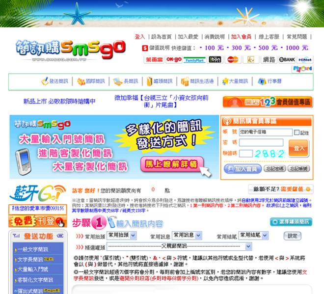 簡訊購SMSGO結合各項專業技術,提供價格優惠、操作便利的簡訊發送平台,供會員一般簡訊發送(大量簡訊發送、國際簡訊、客製化簡訊、生日預約發送、文字長簡訊、彈出式簡訊)、發送記錄查詢(查詢發送、空號、回補、儲值等記錄)、資料管理 (子帳號管理、通訊錄管理、API企業簡訊串接、群組發送、行事曆、罐頭簡訊、常用訊息設定) 等功能服務。簡訊購具有客製化服務,可以針對特定的族群設計不同的簡訊內容,透過簡訊的傳送,做到即時、大量、成本最低廉、目標最精準、效益最直接的廣告行銷,「有效率」的對目標族群傳遞簡訊促銷廣告訊息、節慶活動通知、會員通知管理,不分網內網外失敗不計費,簡訊購提供線上刷卡、ATM轉帳、超商代碼繳費、銀行臨櫃繳款,線上交易,立即開通使用,線上發國內簡訊最低價0.98/則!快!快!快加入會員,享受大量簡訊輕鬆發送的恣意快感。 | ||