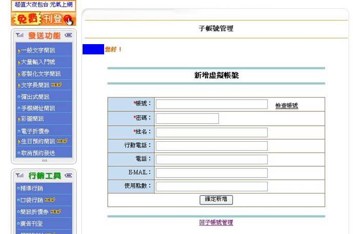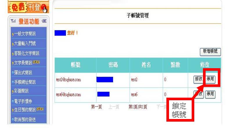 (2)修改子帳號(可修改子帳號資料/密碼重新設定與使用點數) | ||||||